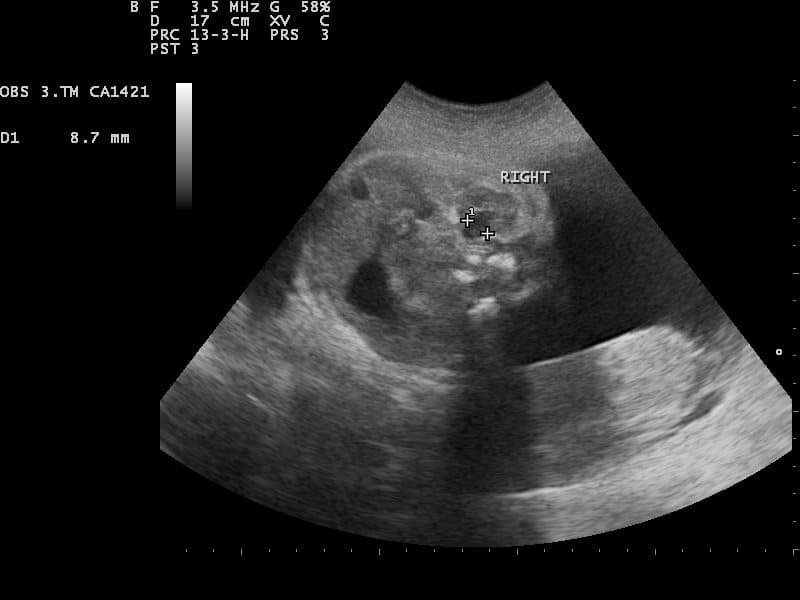 Oligohydramnios - Podcast Version TeachMeObGyn 0:00 / 0:00 1x 0.25x 0.5x 0.75x 1x 1.25x 1.5x 1.75x 2x Oligohydramnios refers to a low level of amniotic fluid during pregnancy. It is defined by an amniotic fluid index that is below the 5th centile for the gestational age, and is thought to affect approximately 4.5% of term pregnancies [AJOC, 2004]. In this article, we shall look at the aetiology, investigations and management of oligohydramnios. By TeachMeSeries Ltd (2026) Fig 1Amniotic fluid centiles during pregnancy. Polyhydramnios is over the 95th centile, oligohydramnios is below the 5th centile Pathophysiology The volume of amniotic fluid increases steadily until 33 weeks of gestation. It plateaus from 33-38 weeks, and then declines – with the volume of amniotic fluid at term approximately 500ml. It is predominantly comprised of the fetal urine output, with small contributions from the placenta and some fetal secretions (e.g. respiratory). The fetus breathes and swallows the amniotic fluid. It gets processed, fills the bladder and is voided, and the cycle repeats. Problems with any of the structures in this pathway can lead to either too much or too little fluid. Anything that reduces the production of urine, blocks output from the fetus, or a rupture of the membranes (allowing amniotic fluid to leak) can lead to oligohydramnios. Aetiology The main causes of oligohydramnios are: Preterm prelabour rupture of membranes Placental insufficiency – resulting in the blood flow being redistributed to the fetal brain rather than the abdomen and kidneys. This causes poor urine output. Renal agenesis (known as Potter’s syndrome) Non-functioning fetal kidneys, e.g. bilateral multicystic dysplastic kidneys Obstructive uropathy Genetic/chromosomal anomalies Viral infections (although may also cause polyhydramnios) Diagnosis of Oligohydramnios The diagnosis of oligohydramnios is made via ultrasound examination. There are two ways of measuring amniotic fluid; amniotic fluid index (AFI) or maximum pool depth (MPD). They have similar diagnostic accuracy, however AFI is more commonly used. Amniotic fluid index is calculated by measuring maximum cord-free vertical pocket of fluid in four quadrants of the uterus and adding them together. Maximum pool depth is the vertical measurement in any area. Clinical Assessment Oligohydramnios is a diagnosis made via ultrasound examination. Therefore, the clinical assessment of the patient is directed at establishing any underlying cause: History Inquire about symptoms of leaking fluid and feeling damp all the time (often described as new urinary incontinence). Examination Measure the symphysis fundal height. Perform a speculum examination (can a ‘pool’ of liquor be seen in the vagina?). Ultrasound Assess for liquor volume, structural abnormalities, renal agenesis and obstructive uropathy. Measure fetal size. Small babies can result from placental insufficiency, which also causes oligohydramnios. There may also be a rise in pulsatility index of the umbilical artery Doppler in placental insufficiency. Karyotyping (if appropriate) – particularly in cases of early and unexplained oligohydramnios. When considering ruptured membranes as a cause for oligohydramnios, a bedside test can be performed to detect the presence of IGFBP-1 (insulin-like growth factor binding protein-1) or PAMG-1 (placental alpha-microglobulin-1) in the vagina. These proteins are found in amniotic fluid, and if detected, strongly suggest membrane rupture. Nevit Dilmen [CC BY-SA 3.0], via Wikimedia Commons Fig 2Ultrasound image of normal fetal kidney. In cases of oligohydramnios, the kidneys should be assessed. Management The management of oligohydramnios is largely dependent on the underlying cause. The two most common causes are rupture of the membranes and placental insufficiency. Ruptured Membranes If oligohydramnios is due to ruptured membranes, labour is likely to commence within 24-48 hours in most pregnancies. In cases of preterm rupture of membranes (i.e. before 37 weeks’ gestation), and where labour doesn’t start automatically, induction of labour should be considered around 34-36 weeks (in the absence of infection). A course of steroids should be given to aid fetal lung development, and antibiotics to reduce the risk of ascending infection. Placental Insufficiency In women where oligohydramnios is caused by placental insufficiency, the timing of delivery depends on a number of factors: Rate of fetal growth Umbilical artery and middle cerebral artery Doppler scans Cardiotocography These babies are likely to be delivered before 36-37 weeks. Prognosis Oligohydramnios in the second trimester carries a poor prognosis. In the majority of these cases, there is premature rupture of membranes (which may or may not be associated with infection), with subsequent premature delivery and pulmonary hypoplasia – which can cause significant respiratory distress at birth When oligohydramnios is associated with placental insufficiency, there is also a higher rate of preterm deliveries (usually through planned induction of labour). These cases will carry a poorer prognosis than that of a normally grown fetus. Amniotic fluid also allows the fetus move its limbs in utero (exercise). Without this, the fetus can develop severe muscle contractures – which may lead to disability despite physiotherapy after birth. Summary Oligohydramnios occurs when the amniotic fluid is < 5th centile for gestational age. The most common causes are premature rupture of membranes (often missed by the mother) and placental insufficiency, however structural abnormalities such as renal agenesis should be considered. Prognosis is linked to gestation at diagnosis and likely development of pulmonary hypoplasia and premature delivery. Treatment is by optimising gestation of delivery. Do you think you’re ready? Take the quiz below Pro Feature - Quiz Oligohydramnios Question 1 of 3 Submitting... Skip Next Rate question: