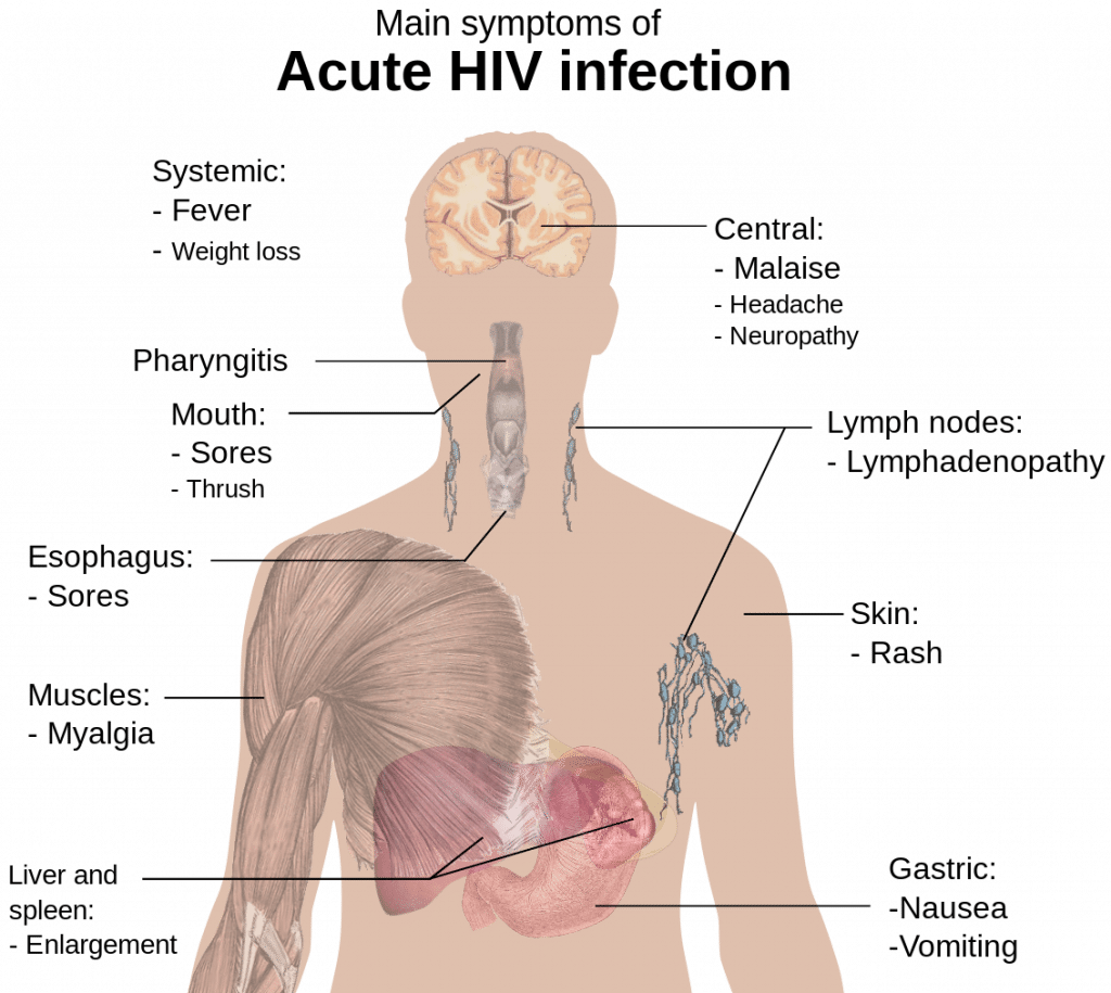HIV - Podcast Version TeachMeObGyn 0:00 / 0:00 1x 0.25x 0.5x 0.75x 1x 1.25x 1.5x 1.75x 2x There are around 37 million people in the world living with human immunodeficiency virus (HIV). HIV is a single stranded RNA retrovirus that infects and replicates within the human immune system using host CD4 cells. Without treatment, destruction of the immune system can lead to acquired immune deficiency syndrome (AIDS). In this article we shall look at the pathophysiology, clinical features, investigations and management of HIV. Pathophysiology HIV is a single stranded RNA retrovirus that infects and replicates with CD4 cells (T helper cells). First, it penetrates the host CD4 cell and empties its contents. Single strands of the viral RNA are converted into double stranded DNA by reverse transcriptase, and combined with the host DNA using the enzyme integrase. When the infected cell divides, the viral DNA is read, creating viral protein chains and the immature virus pushes out of the cell, retaining some cell membrane. The virus matures when the protease enzyme cuts the viral protein chains, and they assemble to create a working virus. The host cell is destroyed during this process. CD4 Levels Upon seroconversion (the process of producing anti-HIV antibodies during primary infection), the patient may experience flu-like symptoms. CD4 levels fall in response to the initial, rapid replication of HIV – and at this stage a person is extremely infectious. Over the next months-years the infection can enter a latent phase. The patient may initially be asymptomatic, but with CD4 levels falling and viral load increasing, they may become more susceptible to infections. The HIV infection can later become symptomatic and eventually, over an average of 10 years, develop into AIDS. By Thomas Splettstoesser (Own work) [CC BY-SA 3.0], via Wikimedia Commons Fig 1The process of HIV infecting and reproducing within cells. Transmission HIV can be transmitted in the following ways: Unprotected sexual contact – vaginal, anal or oral. Sharing of injecting equipment. Medical procedures – blood products, skin grafts, organ donation and artificial insemination. Vertical transmission – from mother to child in utero, during childbirth or breast feeding. People are more likely to catch HIV if they are exposed to a higher viral level, if they have sexually transmitted infections causing anogenital inflammation, or if they have any breaks in the skin or mucosa. HIV is a preventable disease and practitioners need to be able to advise patients regarding transmission reduction and safer sex. At-Risk Groups in the UK Certain groups have a higher risk of becoming infected with HIV. The at-risk groups in the UK include: Men who have sex with men Intravenous drug users Those in high prevalence areas Those who have had unprotected sex with a partner from a region with high HIV prevalence There is a need to encourage testing for those at risk and those with indicator conditions. Clinical Features The clinical features of HIV can be divided into the initial seroconversion illness and symptomatic HIV. Seroconversion Illness 2-6 weeks after exposure, patients may experience a non-specific, flu-like illness. Features include: Fever Muscle aches Malaise Lymphadenopathy Maculopapular rash Pharyngitis Over the next months-years the infection can enter a latent, asymptomatic phase. By TeachMeSeries Ltd (2026) Fig 2Symptoms of the initial seroconversion illness (acute HIV infection). Symptomatic HIV After a latent phase, the HIV infection will become symptomatic. The patient may experience: Weight loss High temperatures Diarrhoea Frequent minor opportunistic infections, e.g. herpes zoster or candidiasis AIDS-Defining illnesses If left untreated, HIV can progress to AIDS. This is an advanced stage of the disease where the immune system is significantly weakened. It is characterised by the development of certain (AIDS-defining) infections and malignancies, for example, pnuemocystis jiroveci pneumonia, non-Hodgkin’s lymphoma, and TB. Investigations Fourth-generation tests are the first line of investigation. These are ELISAs that test for serum (or salivary) HIV antibodies and p24 antigen. They normally give reliable results 4-6 weeks after exposure. Other rapid test kits can give results in 30 minutes, and home-sampling kits and home-testing kits are available. However, these tests are less accurate and if positive, the diagnosis still needs to be confirmed by ELISA. Contact tracing is also important to identify those at risk and prevent further spread of the disease. Management Highly active antiretroviral therapy (HAART) does not cure HIV, but aims to reduce the viral load to undetectable levels in the serum. With an undetectable load, people living with HIV have an excellent prognosis and risk of onward transmission of HIV is very small. It is now recommended that all people with living with HIV should be treated with antiretroviral therapy, which significantly reduces the risk of AIDS-related and non-AIDS related mortality. A number of classes of drugs including nucleoside reverse transcriptase inhibitors (NRTIs), protease inhibitors (PIs), non-nucleoside reverse transcriptase inhibitors (NNRTIs) and integrase strand transfer inhibitors (InSTIs) are used in combination to target the enzymes used in viral replication and maturation. Where possible, these drugs are combined into one tablet to be taken daily: Atripla: tenofovir + emtricitabine + efavirenz Stribild: elvitegravir + cobicistat + tenofovir + emtricitabine Eviplera: tenofovir + emtricitabine + rilpivirine Triumeq: abacavir + lamivudine + dolutegravir Compliance is key and the patient must keep taking the drugs for the rest of their lives. Non-adherence to HAART can result in resistance mutations which make treatment difficult or impossible. It is also important not to forget about managing the psychological impact of living with or being diagnosed with HIV. By JörgenMoorla